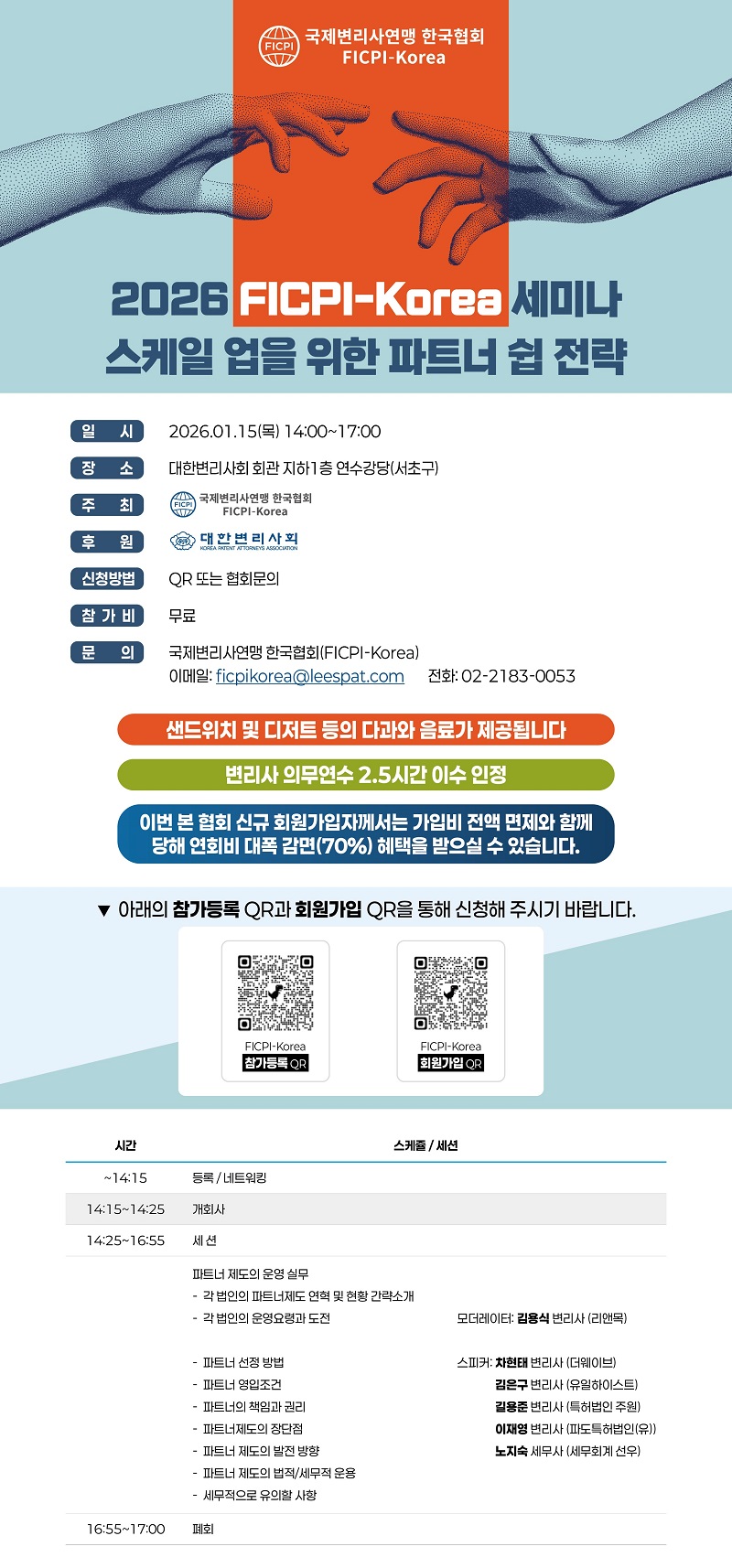 ※문의처 : 국제슬롯사이트연맹 한국협회(FICPI-Korea) / Tel. 02-2183-0053 / Email. ficpikorea@leespat.com ※출석 서명 시간에 한하여 의무연수 이수로 인정되오니 유의하여 주시기 바랍니다.